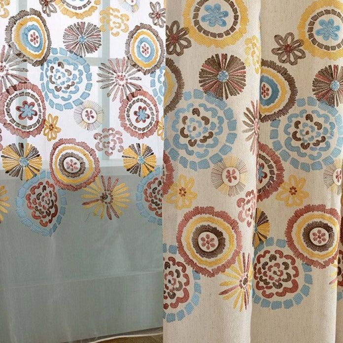 • Motif et couleurs : motifs floraux ronds dans les tons terre de Sienne, ocre, or et bleu passé